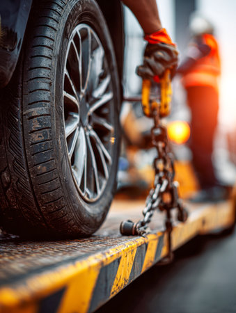 At sunset, a diligent technician in sturdy gloves ensures a tire is tightly fastened with a rugged chain atop a flatbed truck, ready for safe transport during urgent
