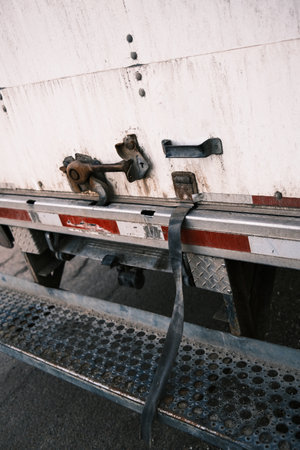 A close-up of a freight truck's rear trailer, showing shipping container doors and safety locks as it's ready to transport goods over long distances.