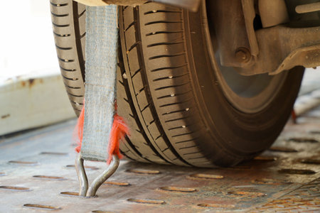 Car tire secured with belt for safety on flatbed tow truck,Securing the load of a car transporter,