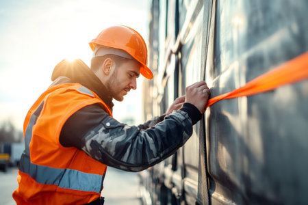 Young male worker in safety vest and hard hat adjusting an orange strap on a truck trailer, ensuring cargo safety