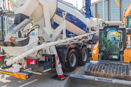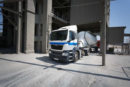 Concrete mixer truck loads concrete at the factory. Transportation of concrete to the construction site. Construction equipment for the delivery of concrete