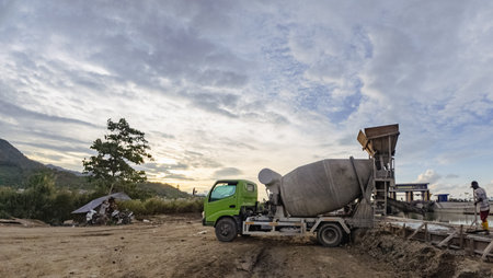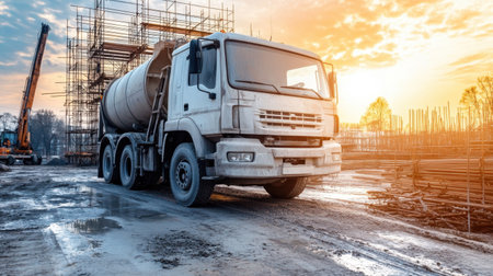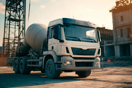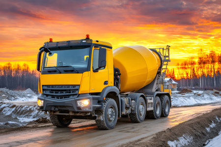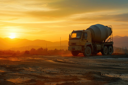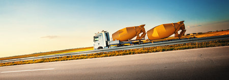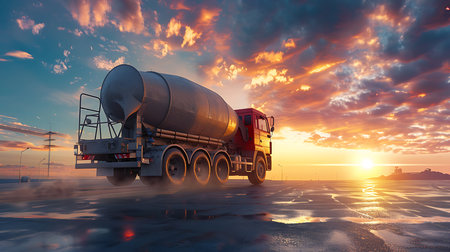 Concrete mixer truck on highway at sunset. Concept of heavy industry.