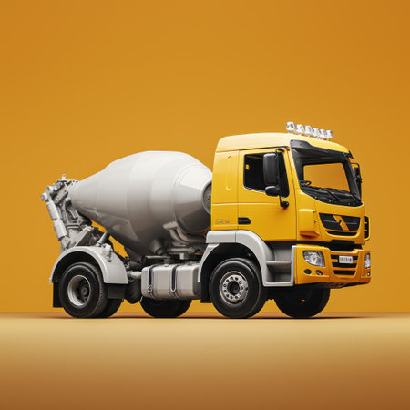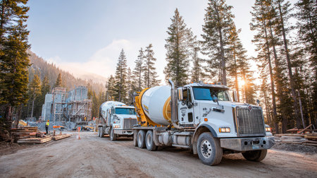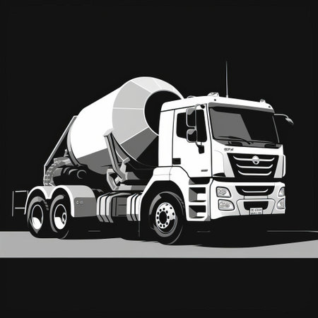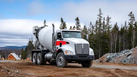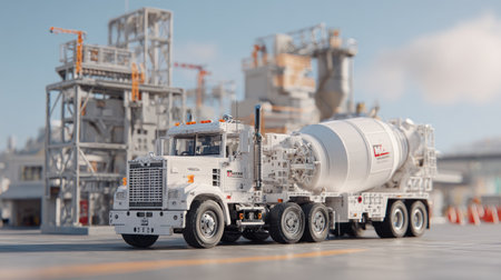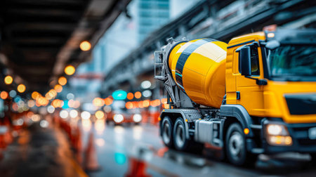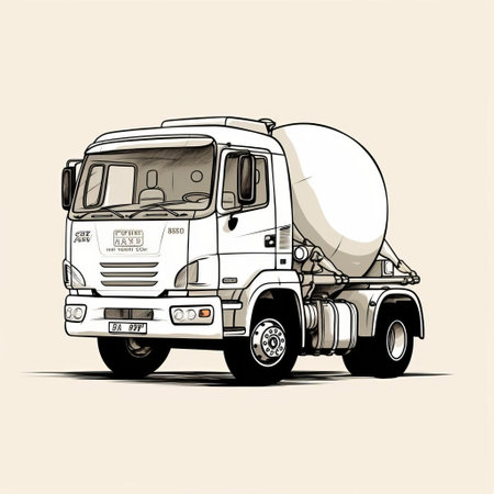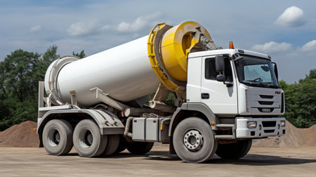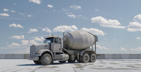 Cement mixer truck drives along a busy highway, surrounded by other vehicles. The clear sky and green trees create a bright, vibrant setting for the scene