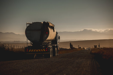 A large tanker truck travels down a dusty gravel road at dawn. Silhouetted against a hazy, mountainous backdrop, the scene captures a quiet moment of industrial transport within a vast, rural South African landscape.