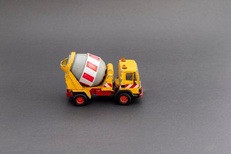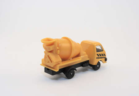 Plastic car. Toy model isolated on a white background. Yellow truck for the transport of building concrete.