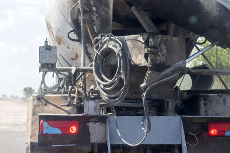 Concrete mixer truck rear view with hoses and burning taillights during road works on an intercity highway. Closeup view