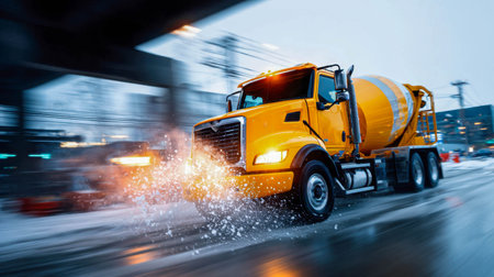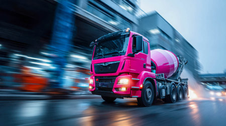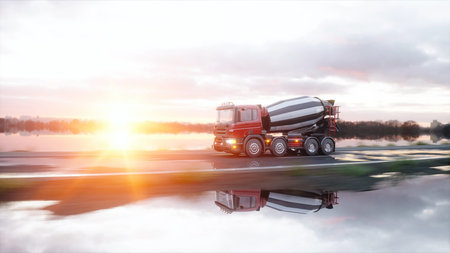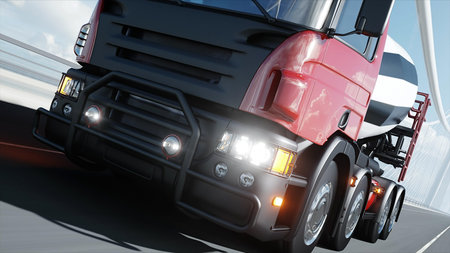 Concrete mixer truck on highway. Very fast driving. Building and transport concept. 3d rendering.