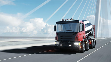 3d model of concrete mixer truck on bridge. Very fast driving. Building and transport concept. 3d rendering.