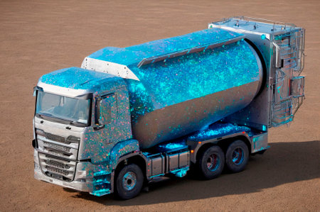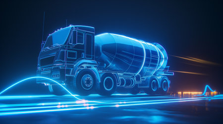 Holographic truck concrete mixer made of many particles. Generative AI.
