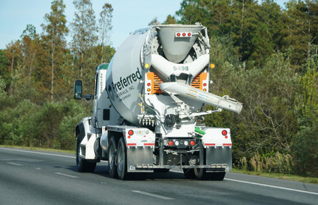 Lakeland, Florida, U.S.A - Nov 10, 2025 - The rear view of a white Preferred Materials, Inc cement mixer truck, unit 9498, traveling on a paved highway flanked by dense greenery.