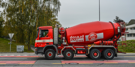 Lucerne, Switzerland - Oct 23, 2018. Cement truck on street in Luzern, Switzerland. Switzerland is the third richest landlocked country in the world.