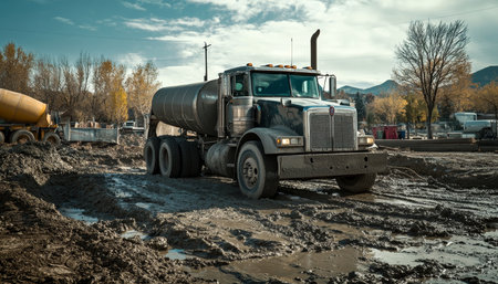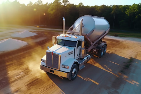 A cement mixer truck is shown on a dusty road at sunset. The low sun creates a warm, golden light that illuminates the scene and casts long shadows. The truck's drum is visible, and the road surface is rough with dirt and debris. In the background, buildings and other vehicles are blurred, suggesting an active urban construction environment. The image captures the essence of construction work during the golden hour.