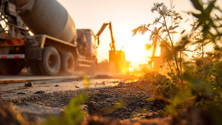 The image depicts a construction site bathed in the warm glow of sunset. A cement mixer truck is in the foreground, and an excavator is visible in the background. Dust is kicked up, and the sun creates a strong lens flare. Green foliage is in the foreground, contrasting with the industrial elements.