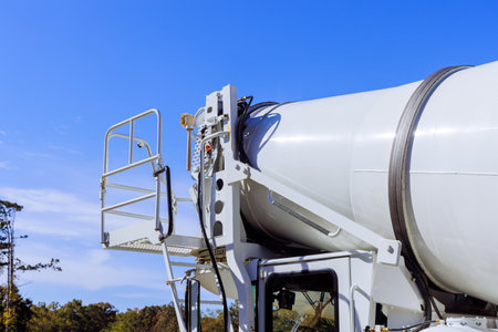Construction site liquid cement concrete being poured by concrete mixer truck