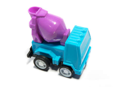 Children's plastic multi-colored toy concrete mixer on a white background. Toy vehicles, outdoor games for children.
