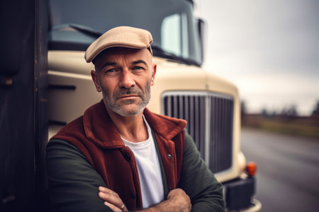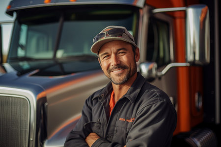 illustration of a smiling male truck driver standing in front of his truck with Generative AI