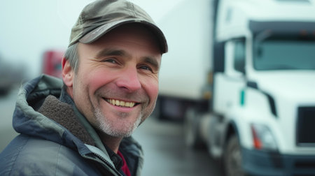 Confident Male Truck Driver Smiling In Front of His Big Rig, Representing Transportation Industry