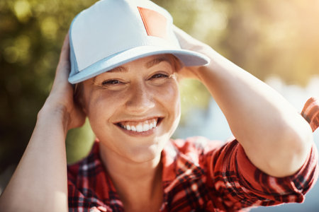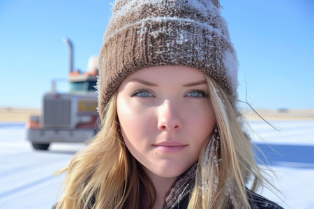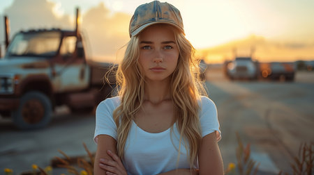 stunning blonde woman in a trucker cap stands confidently by her truck, arms crossed
