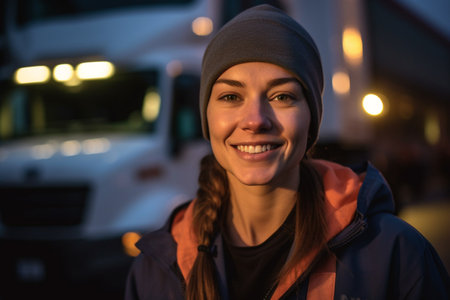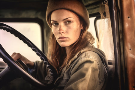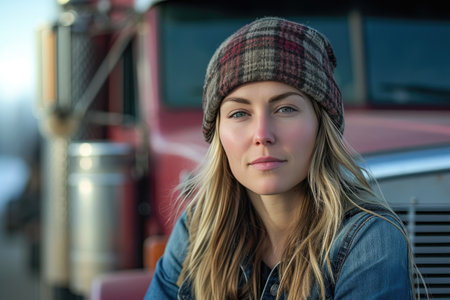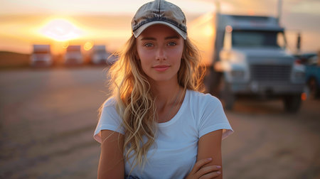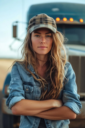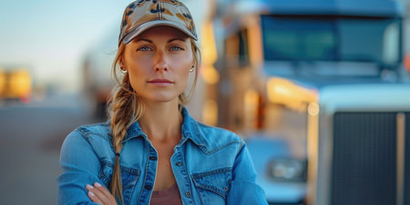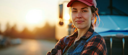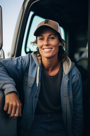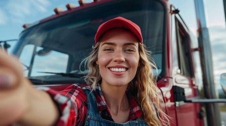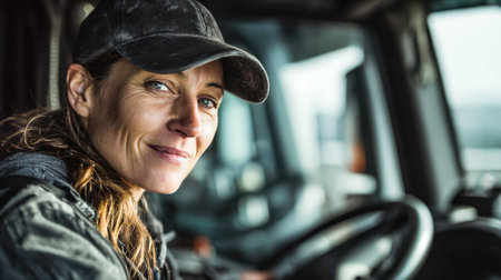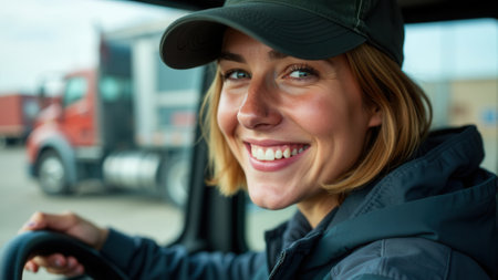 A Confident And Energetic Female Trucker Ready To Take On The Road. Concept Female Empowerment In The Workplace, Breaking Gender Stereotypes, Women In Transportation, Pursuing Non-Traditional Careers.