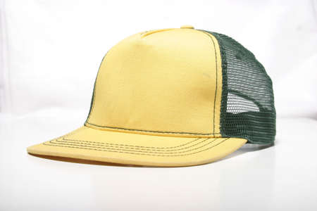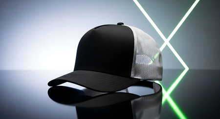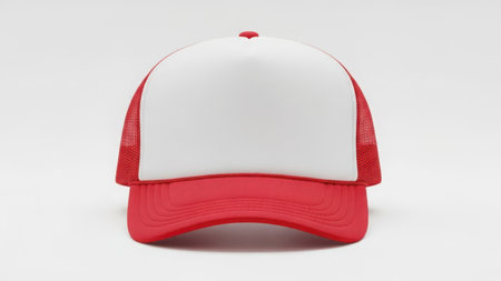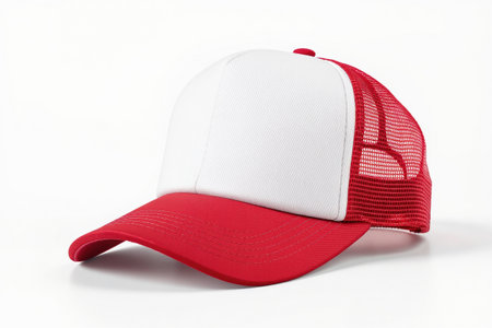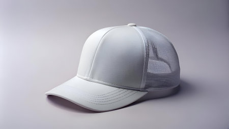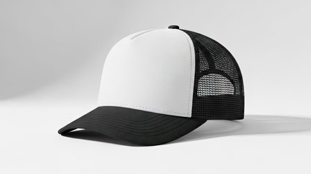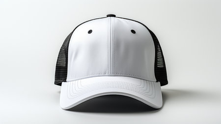 A crisp white trucker hat with a mesh back. perfect for adding a touch of casual style to any design. The hat is isolated on a neutral background. making it ideal for mockups and branding.