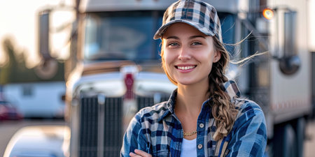 A Cheerful Woman Trucker Posing With Confidence, Ready For The Road. Concept Bold And Beautiful: Women In The Trucking Industry, Empowering Female Truckers.