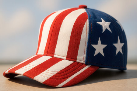 Positioned on an illuminated outdoor surface, a blue cap with a blank, bordered patch draws attention to its sleek design and potential for customization. perfect for casual everyday wear or sun protection, the image emphasizes the cap's versatile application. Generative AI