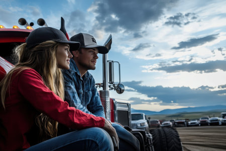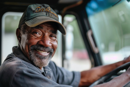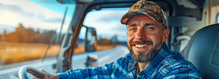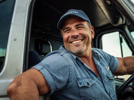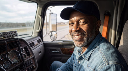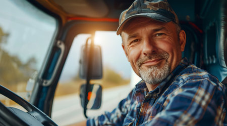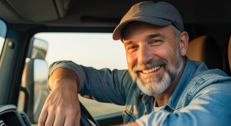 A cheerful driver sits in the cab of a truck, enjoying the open road and the freedom that comes with it. AI Generative AI