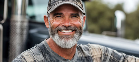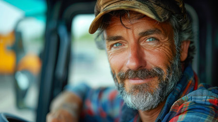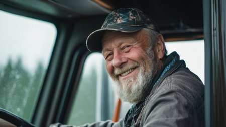 Confident mature man with gray beard smiling while sitting in the driver's seat of a truck during a sunny afternoon.