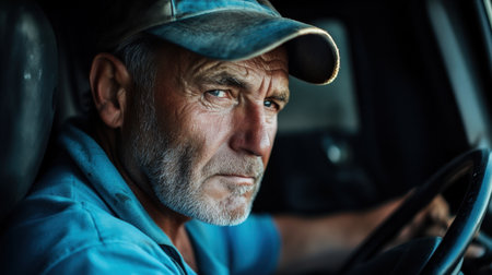 A serious mature man in a blue shirt drives a vehicle, conveying focus and determination. His weathered face reflects hard work and experience, making this portrait powerful and evocative.