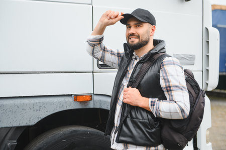 Truck driver wearing a cap and vest, holding a backpack, standing next to his truck, representing logistics and delivery