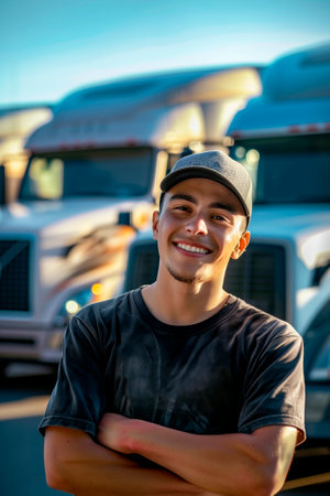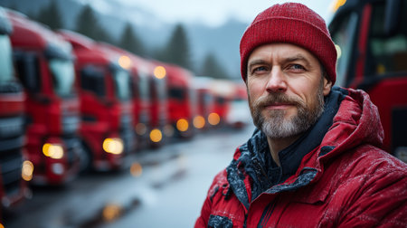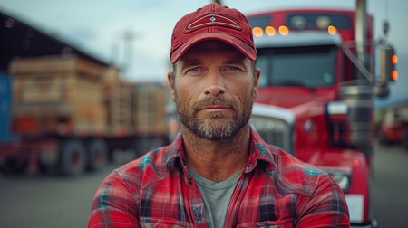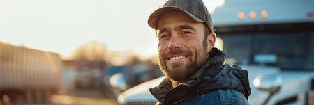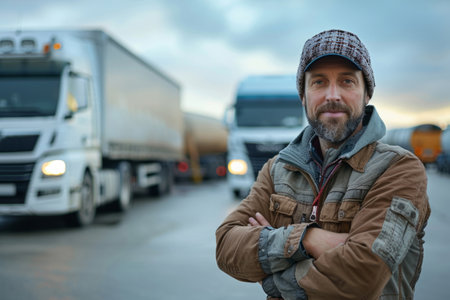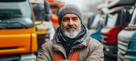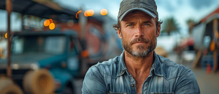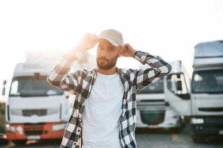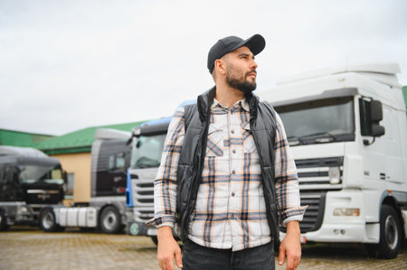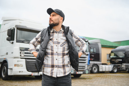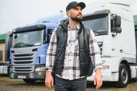 Truck driver man wearing a cap and vest, standing confidently in front of heavy goods vehicles at a transport depot