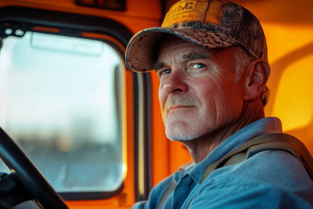 Experienced truck driver with a focused expression in a bright orange cab during sunset