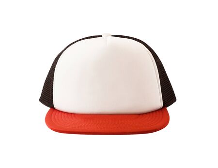 Mockup of baseball cap with black mesh and white front. Trucker hat isolated on white background