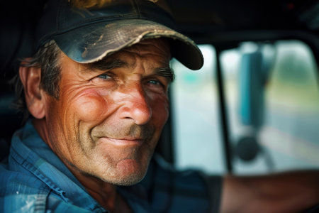 Smiling middle aged truck driver sitting in cab wearing denim shirt and cap during daytime highway journey with bright natural light.