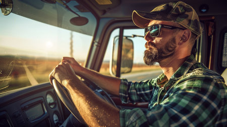 Middleaged truck driver in casual attire driving a truck on a long transportation route. Concept Trucker's Lifestyle, Long Haul Drives, On the Road Again, Transportation Routes, Casual Attire