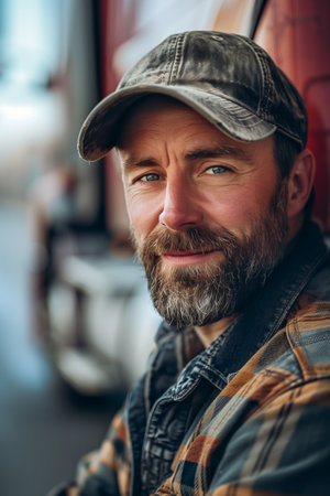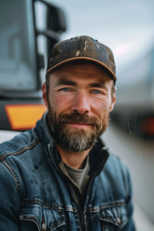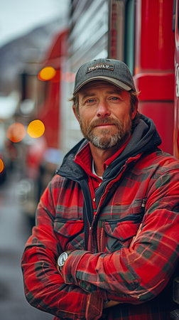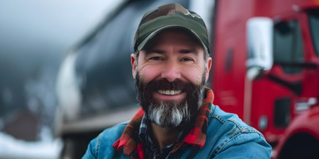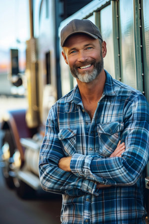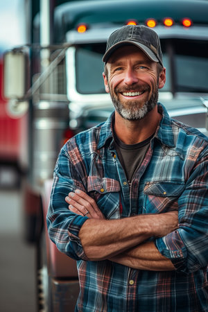 Smiling bearded trucker with crossed arms, in front of his truck, exuding confidence