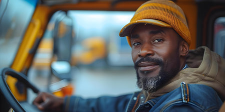 An African man operating a cargo truck at a logistics center, prepared for transportation and delivery. Concept Transportation Industry, Logistics Operations, Cargo Truck Driver, African Man