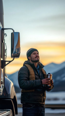 The tired driver enjoys a quiet break beside his truck, sipping from a thermos as mountains stand in the soft light