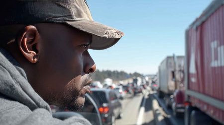 A thoughtful truck driver looks out from his cab, gazing at the road ahead, captured in a moment of quiet contemplation.