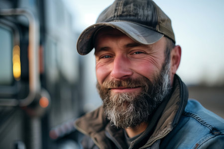 Truck driver with a beard and cap standing outdoors at a parking lot with semi trucks, looking away from the camera
