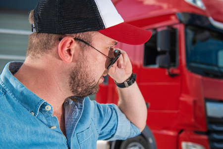 Caucasian Truck Driver in His 30s Looking Straight Over His Sunglasses. Modern Semi Truck in a Background. Transportation Industry Theme.