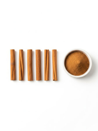 A collection of cinnamon sticks arranged neatly alongside a small bowl filled with ground cinnamon, set against a clean white background. Perfect for culinary and spice-related themes.