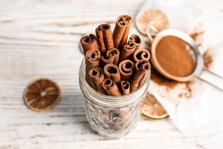 Jar with aromatic cinnamon sticks on wooden background