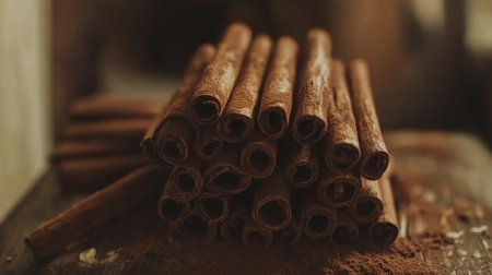 Aromatic cinnamon sticks on rustic wooden table, warm brown tones.