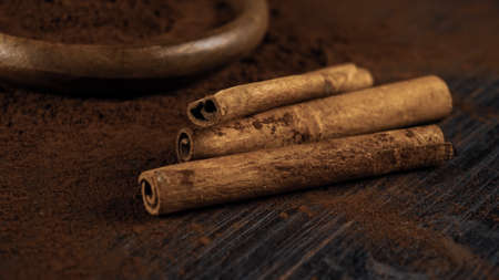 Cinnamon sticks and cocoa powder on a dark background. Selective focus.