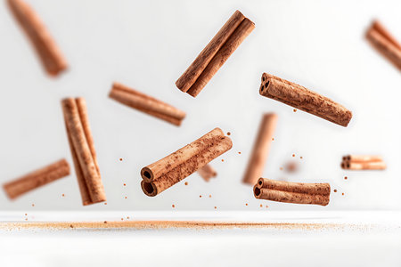 Cinnamon sticks levitate on a white background
