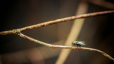 Close up a Fly perched on a tree branch, dry wood with isolated background, Common housefly, Colorful insect, Selective focus.