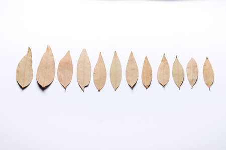 Dried bay leaves isolated on white wooden background with copy space.