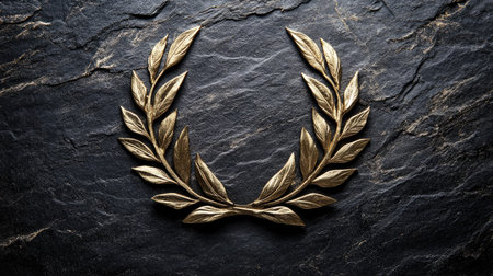 A stylized black and gold laurel wreath rests on a dark textured background, symbolizing achievement or victory.