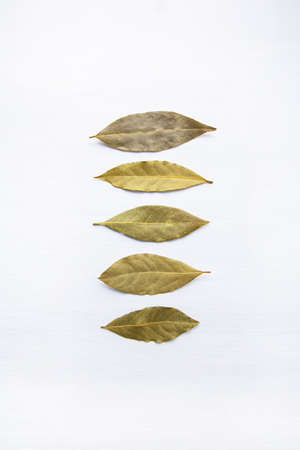 Dried bay leaves on white wooden background.